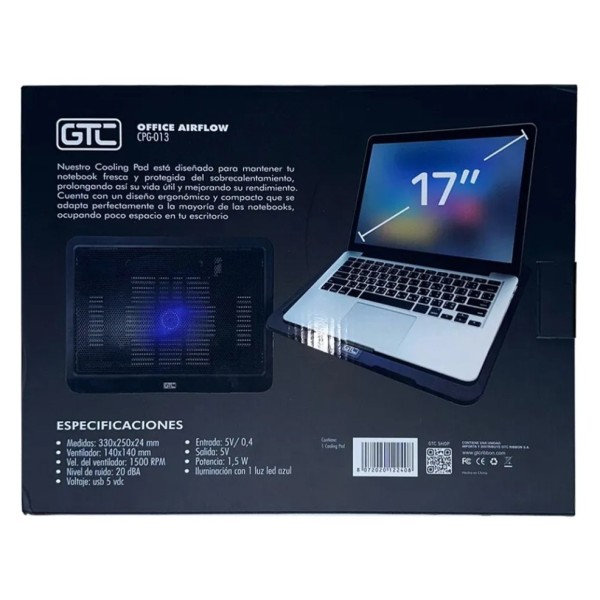 DescripciónCooling Pad para Notebook: ¡Mantén tu portátil fresco y protegido!¿Tu portátil se sobrecalienta durante largas sesiones de trabajo o juego? ¡Nuestro Cooling Pad es la solución perfecta! Diseñado para mantener tu equipo a una temperatura óptima este soporte cuenta con un potente ventilador que disipa el calor de manera eficiente.Características:• Enfriamiento eficiente: El ventilador de 140 mm proporciona un flujo de aire constante para mantener tu portátil fresco.• Diseño ergonómico: Eleva tu portátil a una posición cómoda para trabajar y reducir la tensión en el cuello y la espalda.• Iluminación LED: Las luces LED azules añaden un toque estético a tu setup y te permiten ver el ventilador en funcionamiento.• Fácil de usar: Simplemente conecta el Cooling Pad a un puerto USB de tu computadora y enciéndelo.• Compatible con la mayoría de portátiles: Se adapta a la mayoría de los tamaños de pantalla gracias a sus dimensiones generosas.Beneficios:• Mayor rendimiento: Un portátil fresco funciona de manera más eficiente y rápida.• Aumenta la vida útil: Protege los componentes internos de tu portátil del sobrecalentamiento.• Mayor comodidad: Trabaja o juega durante horas sin sentir molestias por el calor.• Diseño elegante: Combina funcionalidad y estilo para complementar tu setup.Especificaciones:• Dimensiones: 330 x 250 x 24 mm• Ventilador: 140 x 140 mm 1500 RPM• Nivel de ruido: 20 dBA• Voltaje: USB 5V VDC• Potencia: 1.5W• Entrada: 5V0.4• Salida: 5V• Iluminación con 1 luz led azul¡No dejes que el sobrecalentamiento afecte tu productividad! Con nuestro Cooling Pad podrás disfrutar de tu portátil por más tiempo y con mayor comodidad.