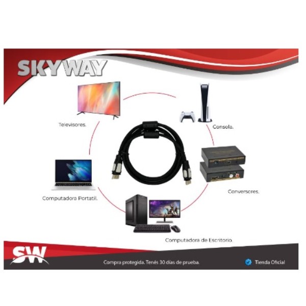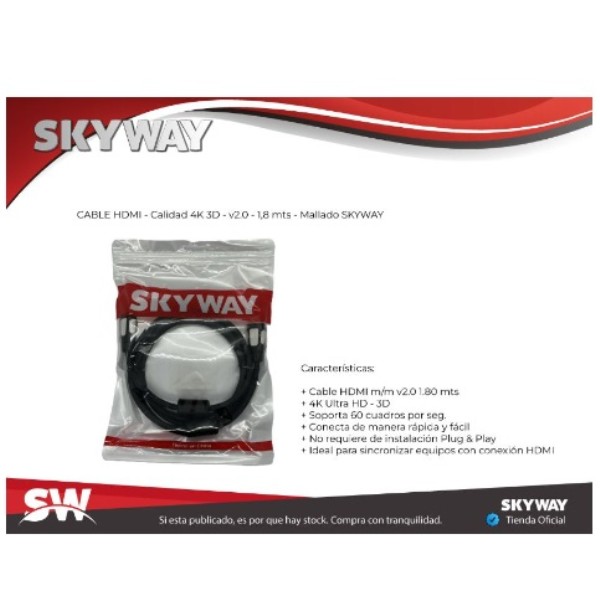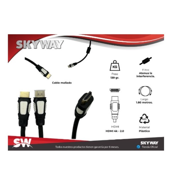 Cable Hdmi A Hdmi Mallado 1,8 metros V 2.0 4k y Full HD – Skyway GM 3389Ideal para ver contenido con Playstation, Computadoras, Notebooks, Consolas y cualquier otro equipo que quieras utilizar con resolución 4K y 60 cuadros por segundo.Características:Largo:1,8 metrosNo requiere instalación de plugConecta de manera rápida y fácilIdeal para sincronizar equipos con conexión HDMIEste cable no requiere filtros ya que posee una capa aislante de interferencias por lo que es mucho más cómodo para colocar en lugar difíciles o pasar por muebles y espacios pequeños