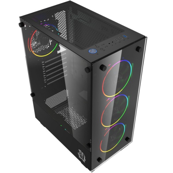Acero:SPCCEspesor del chasis:045mmPanel frontal:GlassPanel lateral:Left side full glassPuertos:1*USB3.0+2*USB2.0 + HD AudioBahías de unidad:3.5 HDD*1 2.5 SSD*1 or 3.5 HDD*2Altura de la CPU:170mmTarjeta VGA:320mmCompatibilidad con tipos de mother:Micro ATX ATXTamaño:335*200*450mmVentilador frontal:1*120mm RGB inside ring fanVentilador trasero:3*120mm Fixed Slim ring fan