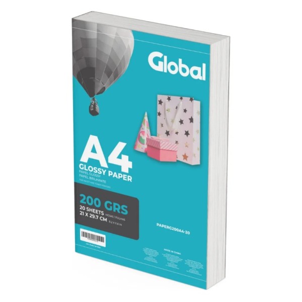 Tipo de papel: Glossy (Brillo)Gramaje: 200Marca: GLOBALTamaño: A4Cantidad: 20 Hojas