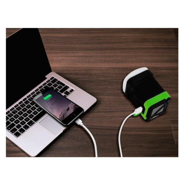 Descripción:• Incluye función power bank• Salida de 5VDC 2A• Incluye batería recargable 10000mah• A prueba de agua IP65• Incluye 5 modos de iluminación (alta, media, baja, flash y SOS)• 4 Watt de potencia, 200 lúmenes• Con gancho para una fácil ubicación• Autonomía 2560180hs mínimo respectivamente en cada modo (alta, media, baja)