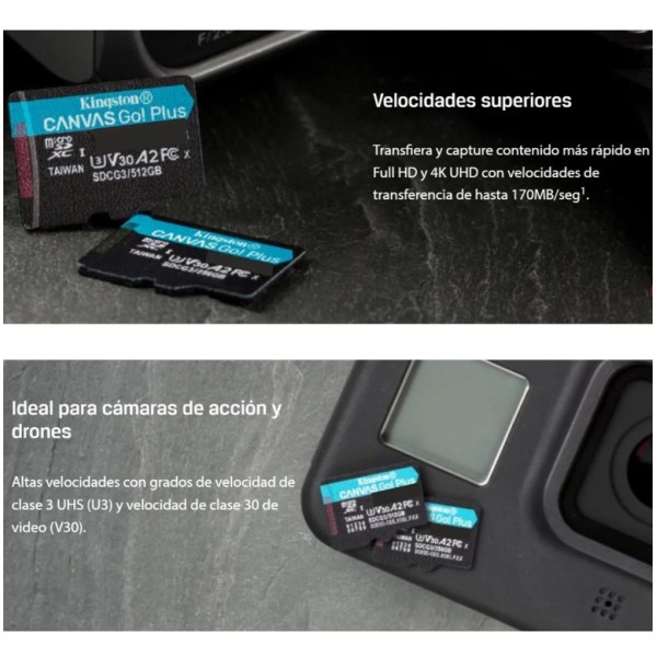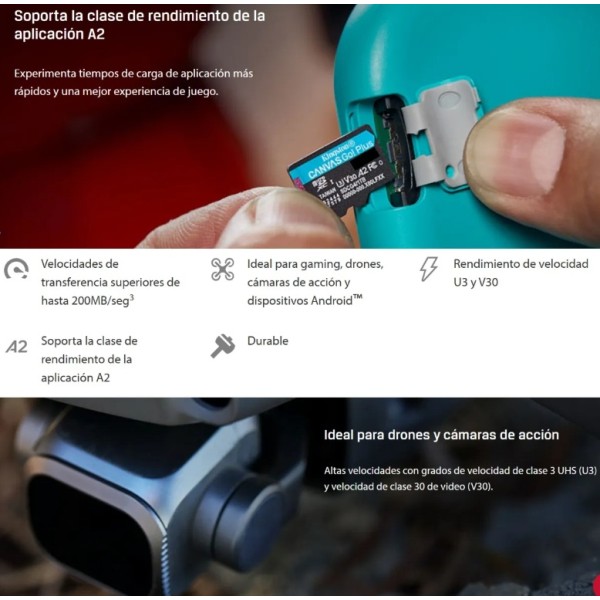 La tarjeta microSD Canvas Go! Además la microSD está diseñada para personas aventureras y amantes de los juegos para móviles y ofrece velocidades de lectura de hasta 200 Mbs.