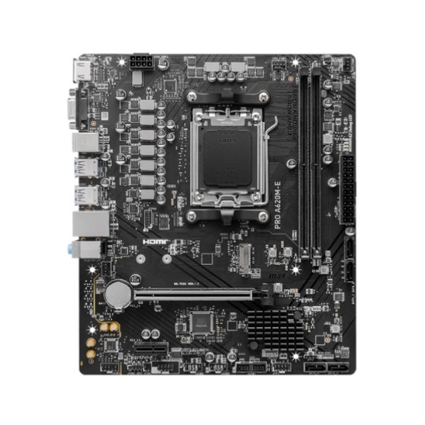 DescripciónLa placa madre MSI AM5 DDR5 HDMI VGA M.2 USB 3.2MSI AM5 DDR5 HDMI VGA M.2 mATX- Marca: MSI- Modelo: PRO A620M-EEspecificaciones mTX PRO A620M-E AM5 DDR5 MSIChipset- AMD A620CPU- Compatible con procesadores de escritorio AMD Ryzen serie 80007000- Socket AM5Memoria- 2 unidades DDR5, capacidad máxima de memoria 96 GB- DDR5 6800+ (OC) 6600 (OC) 6400 (OC) 6200 (OC) 6000 (OC) 5800 (OC) 5600 (OC) 5400 (OC) 5200 (OC) 5000 (OC) 4800 (JEDEC) MHzFrecuencia máxima de overclock:- 1DPC 1R Velocidad máxima de hasta más de 6.800 MHz- 1DPC 2R Velocidad máxima de hasta más de 6.000 MHz- Soporta el modo de doble canal- Soporta memoria sin ECC y sin búfer- Compatible con AMD EXPOIntegrated Graphics1x HDMI- Soporte HDMI 2.1 con HDR, resolución máxima de 4K 60 Hz*1x VGA- Soporte VGA, resolución máxima de 2048 x 1536 50 Hz, 2048 x 1280 60 Hz, 1920 x 1200 60 Hz*Disponible solo en procesadores con gráficos integrados. Las especificaciones gráficas pueden variar en función de la CPU instalada.Slot1x ranura PCI-E x16- Soporta x16 (para procesadores Ryzen de la serie 7000)- Soporta x8 (para procesadores Ryzen 7 8700G y Ryzen 5 8600G)- Soporta x4 (para procesadores Ryzen 5 8500G)1x ranura PCI-E x1- PCI_E1 Gen PCIe 4.0 admite hasta x16 (desde la CPU)- PCI_E2 Gen PCIe 3.0 admite hasta x1 (desde el chipset)