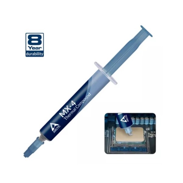 Marca: ARCTICModelo: MX-4——————————————————-La Pasta Térmica ARCTIC MX-4 es ideal para todo tipo de procesador mejora la disipación térmica en CPU Chipset o GPU y no es eléctricamente conductivo.La consistencia del MX-4 está diseñada para una aplicación sencilla una conductividad térmica superior y una gran durabilidad.Con su fórmula el MX-4 garantiza una disipación de calor excepcional de los componentes y admite la estabilidad necesaria para llevar su sistema al límite.La Pasta Térmica ARCTIC MX-4 está compuesta de micropartículas de carbono que conducen a una conductividad térmica extremadamente alta. Garantiza que el calor generado por la CPU o GPU se disipa de manera rápida y eficiente.Excelente en rendimiento MX-4 es el mejor compañero para overclockers y entusiastas.>>> CONSIDERADA COMO LA PASTA TÉRMICA NÚMERO 1 EN TODO EL MUNDO <<<+++ Ideal para aplicar en PS4 +++——————————————————-MUY SENCILLO DE APLICAR: Con una consistencia ideal el MX-4 es muy fácil de usar incluso para principiantes.APLICACIÓN SEGURA: La Pasta Térmica ARCTIC MX-4 NO contiene partículas metálicas y NO es conductor eléctrico por lo que no queda riesgo de cortocircuito y ofrece más protección al CPU y las tarjetas VGA. A diferencia del compuesto de plata y cobre garantiza que el contacto con cualquier pasador eléctrico no ocasione daños de ningún tipo.ALTA DURABILIDAD: A diferencia del compuesto térmico de metal y silicio el rendimiento del MX-4 no se ve comprometido con el paso del tiempo. Una vez aplicado no necesita aplicarlo una segunda vez ya que durará al menos 8 años.——————————————————-Especificaciones Técnicas:Conductividad Eléctrica: NOEfecto Capacitivo: NOConductividad Térmica: 85W(mK)Viscosidad: 870Densidad Específica: 250grcm³PASTA-GRASA TÉRMICA DISIPADORA DE CALOR ARCTIC MX-4
