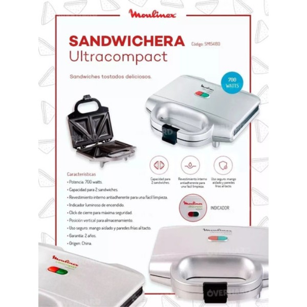 -Potencia: 700 watts.-Capacidad para 2 sandwiches.-Revestimiento interno antiadherente para una fácil limpieza.-Indicador luminoso de encendido.-Uso seguro: mango aislado y paredes frías al tacto.-Click de cierre para máxima seguridad.-Posición vertical para almacenamiento.-Con enrollacable.