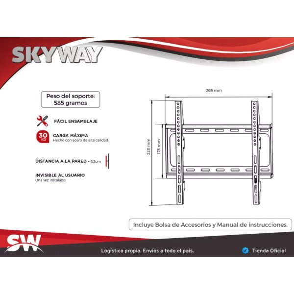 SOPORTE DE TV – LED – LCD – SmartTV – FIJO 23 a 42 PulgadasSKYWAYEsta diseñado para montar pantallas de Plasma, LCD, HDTV, 3D Y Leds de 23 a 42 con un peso máximo de 30 kg.Fabricado en metal negro, invisible al usuario una vez instalado.Incluye herramientas para montar a pared.Fácil y rápida instalación.Incluye manual de usuario.Para pantallas de: 23´´ – 42´´.Distancia a la pared: 2,3cm.Vesa: Máximo 200×200.Soporte fuerte y resistente.Hecho con acero de alta calidad.• Producto Nuevo en Caja •