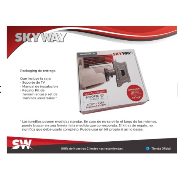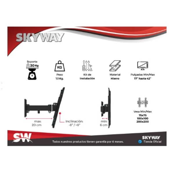 Soporte de tv móvil – ST7 SKYWAY – GM-4060Está diseñado para montar pantallas de 17 a 42 con un peso máximo de 25 kg.CARACTERÍSTICAS:• Carga máxima 25kg• Fabricado en metal negro• invisible al usarlo una vez instalado.• Incluye herramientas para montar a la pared.• Fácil y rápida instalación.• Incluye manual de usuario• Para pantallas de: 17”-42”.• Distancia a la pared: 6.2 cm a 20 cm* inclinación -8 grados a + 8 grados* Giro 180 grados• Vesa: Máximo 200×200.• Vesa: Mínimo 100×100• Soporte móvil fuerte y resistente.• Hecho con acero de alta calidad.• Producto Nuevo en Caja