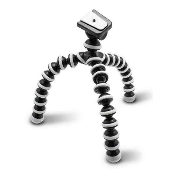 -Trípode con rótulas flexibles-Se adapta a cualquier obstáculo o superficie-Superficie fabricada en: PVC recubierto de goma.-La cámara se monta sujetándola con el tornillo de seguridad de la zapata-Válido para cámaras réflex DSLR (Canon, Nikon, Olympus, Pentax, etc.), cámaras compactas y de video-El trípode perfecto para colocar tu cámara en posiciones y superficies imposibles..-3 patas flexibles que pueden agarrarse a cualquier sitio, adaptándose rápida y fácilmente.-Las patas tienen movilidad completa-La superficie de goma ayuda a que el trípode no resbale, ofreciendo una sujeción muy segura y estable.-Increíble variedad de posiciones y posibilidades.-Cambiar la posición es muy fácil y rápido.-Al ser flexible se puede plegar ocupando poquísimo espacio.-Muy resistente.-Peso y medidas:-Medidas trípode: 24 x 5 x 4 cm.-Peso: 150 gramos